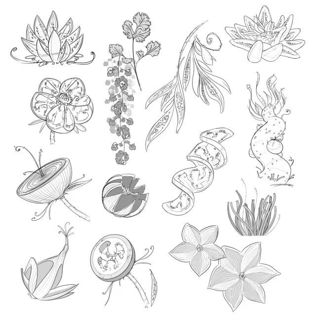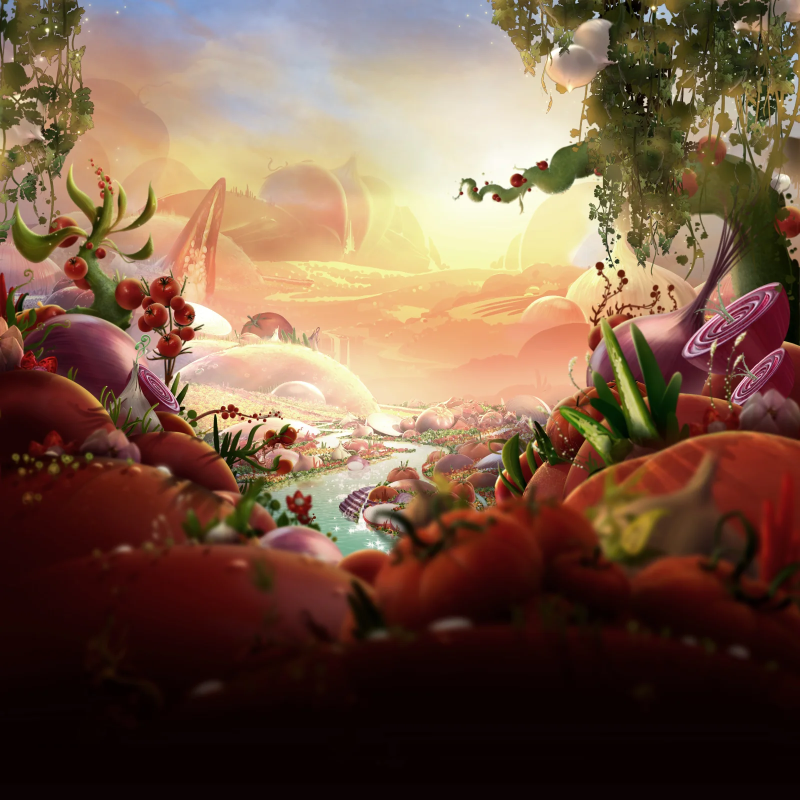 In addition to the world itself... the details within the world was an important design to consider. The term "Divine Botany" was coined to refer to formations, clusters, and magical combinations of the primary ingredients. Nicholas encouraged the designers to use the whole ingredient not just the typical cuts or familiar forms. We wanted to create a place where otherwise mundane vegetables were elevated both in their beauty but also in the inventive ways they can mutate and combine.