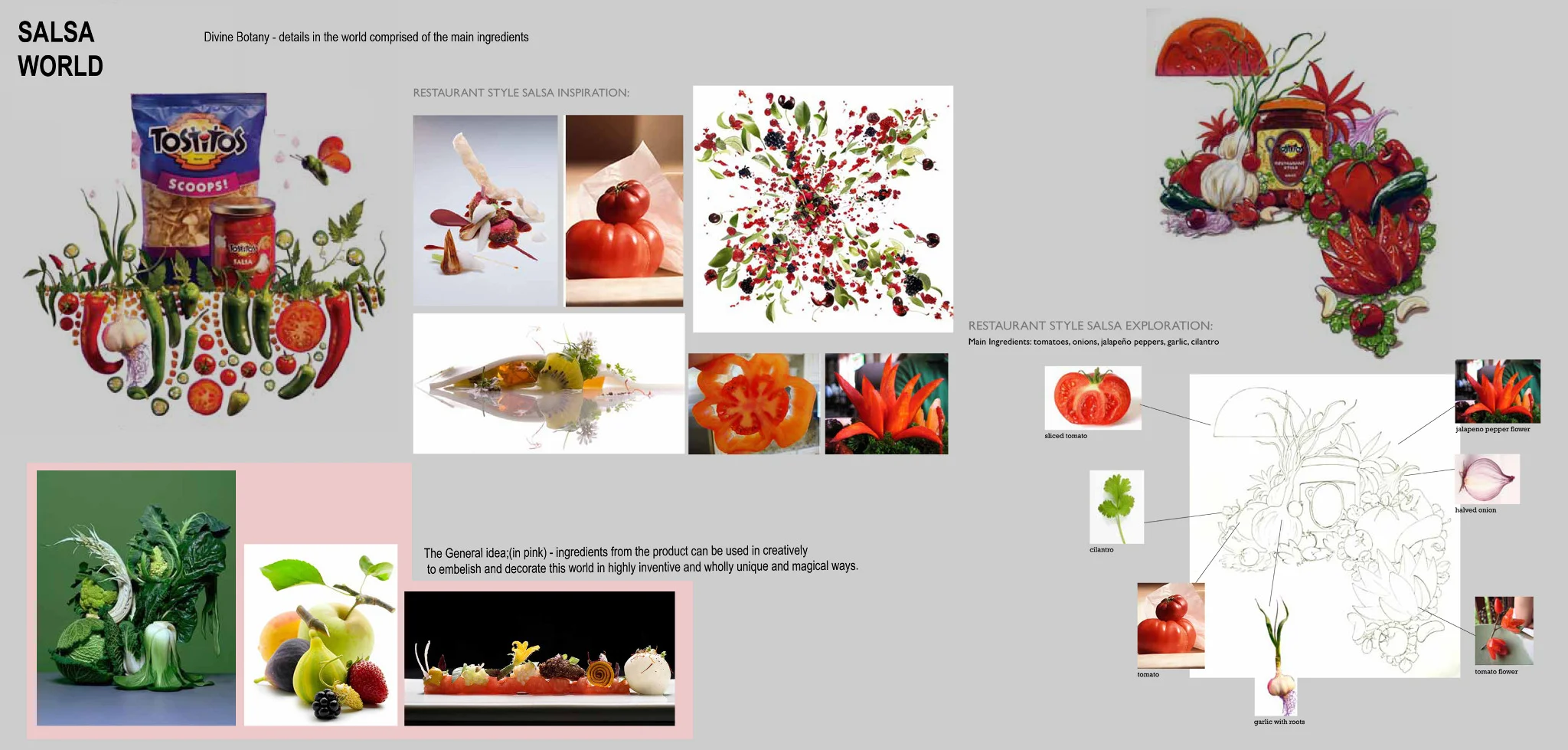 To help explain how Nicholas intended to have Salsa's razor sharp hem slice through the plump vegetables in a way that captured a "violent beauty" he assembled this mood piece to go along with his style frame from the pitch.