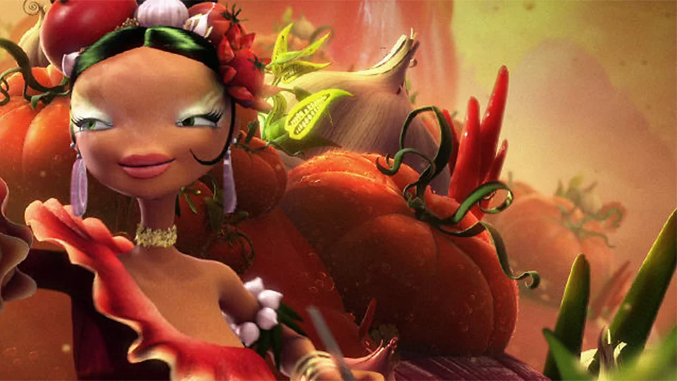 Salsa's world is one of fanciful abundance - idyllic lighting and optimism. Frito Lay was looking for creation myths for their dips... so it seemed fitting in this case to have Salsa's creation... her magical reveal take place as the sun rises. Capturing the essence of something "new" imbued with freshness and warmth. This also fit with the materials from which her dress was constructed. Salsa was to wear a flamenco inspired dress made of organic floral materials - with serrated hems - this way she could become a graceful "human-food processor" transforming the landscape into delicious product.